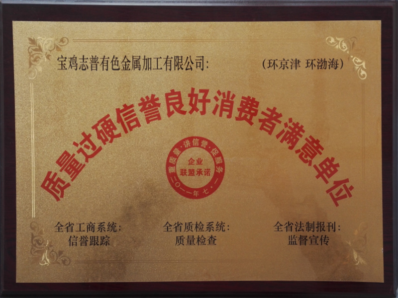 寶雞志普有色金屬加工有限公司被授予質(zhì)量過硬信譽良好消費者滿意單位并頒發(fā)證書。