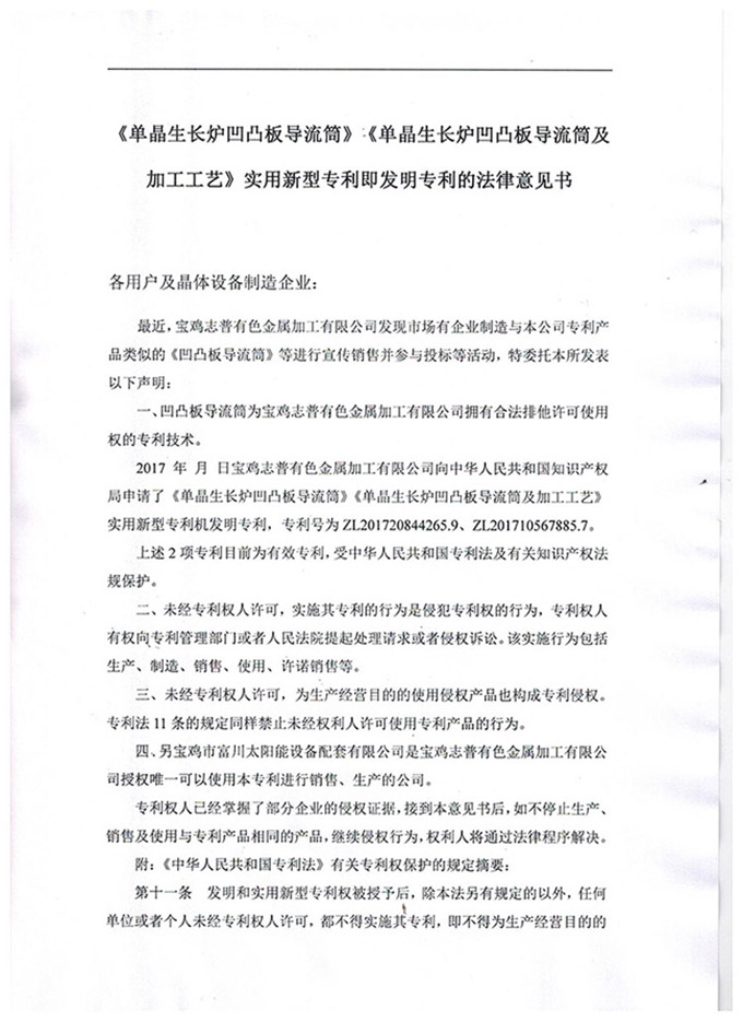 《單晶生長(zhǎng)爐凹凸板導(dǎo)流筒》發(fā)明專利的法律意見書